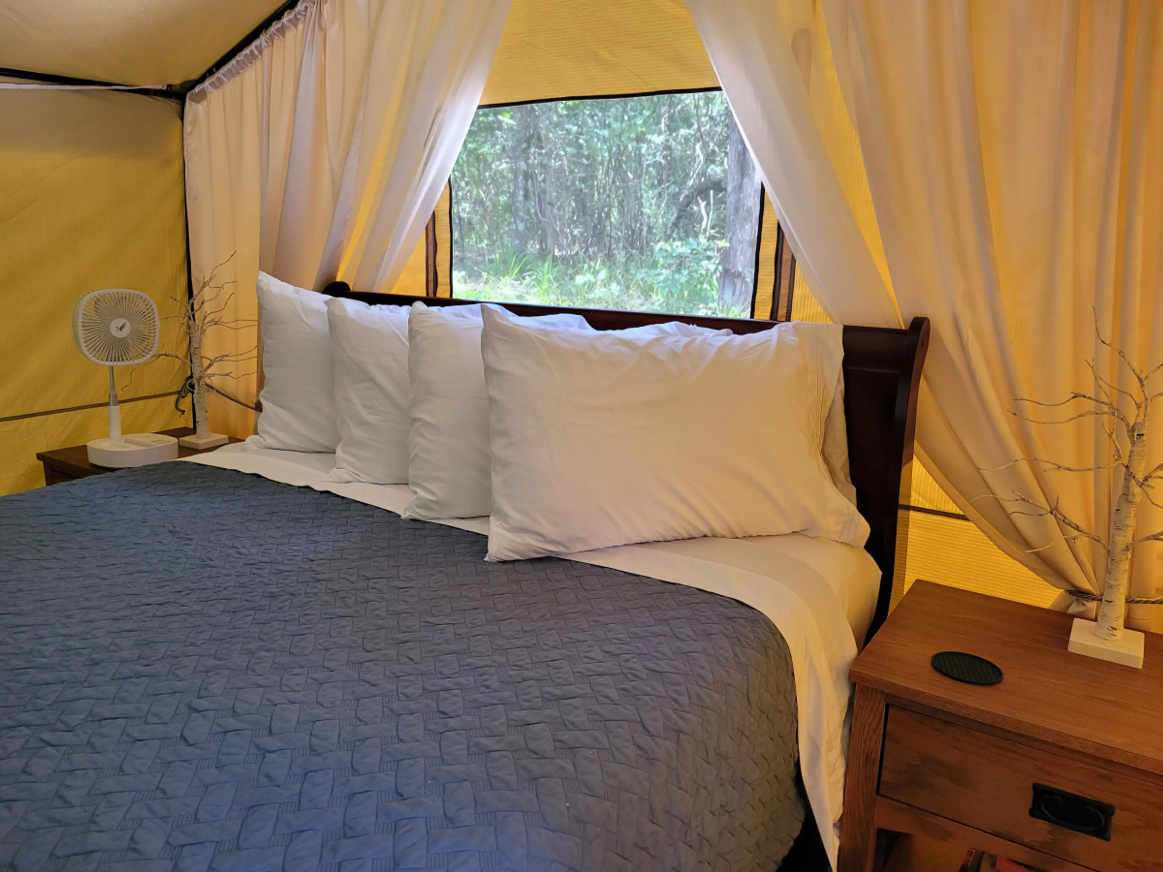Unplug and escape into the forest for a private and secluded off-grid glamping experience for 2 on 16 wooded acres only 3 miles from downtown Hot Springs National Park! 10x12 safari tent with a pillow top queen sleigh bed and layers of cozy bedding, well equipped prep kitchen, fire ring, firewood, h...